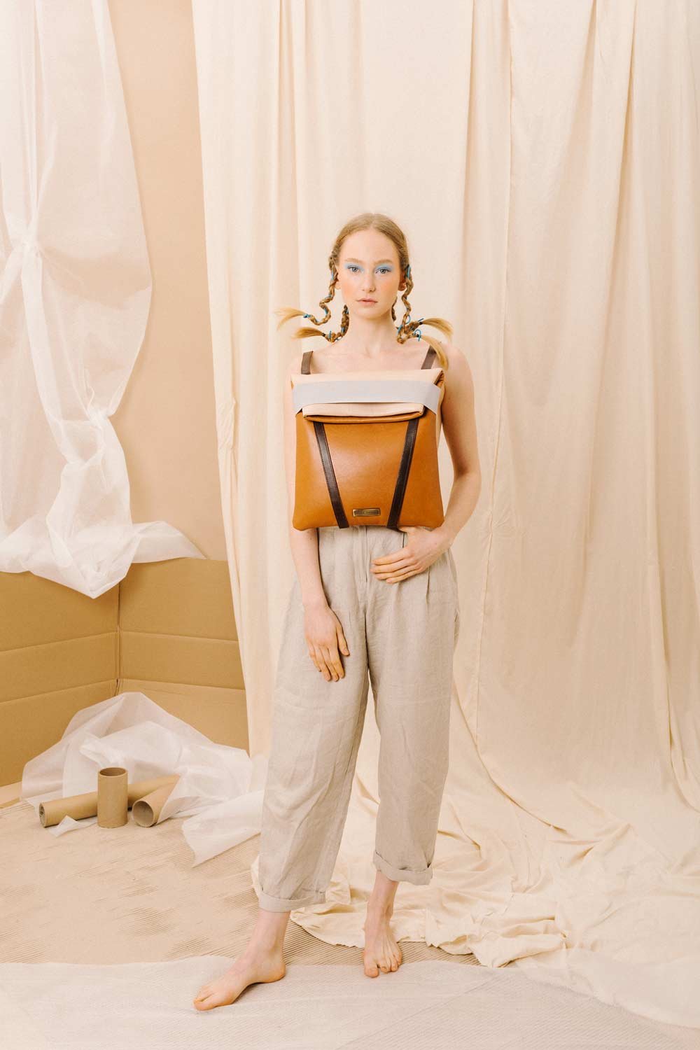 Slim laptop backpack in leather. Brown leather and Back in soft. pale pink color. Grey elastic and adjustable straps 70cm – 80cm. Two inner pockets. Dimensions: 35 x 33 cm. With an extra handle strap. REF. MMBPSD Made in Portugal