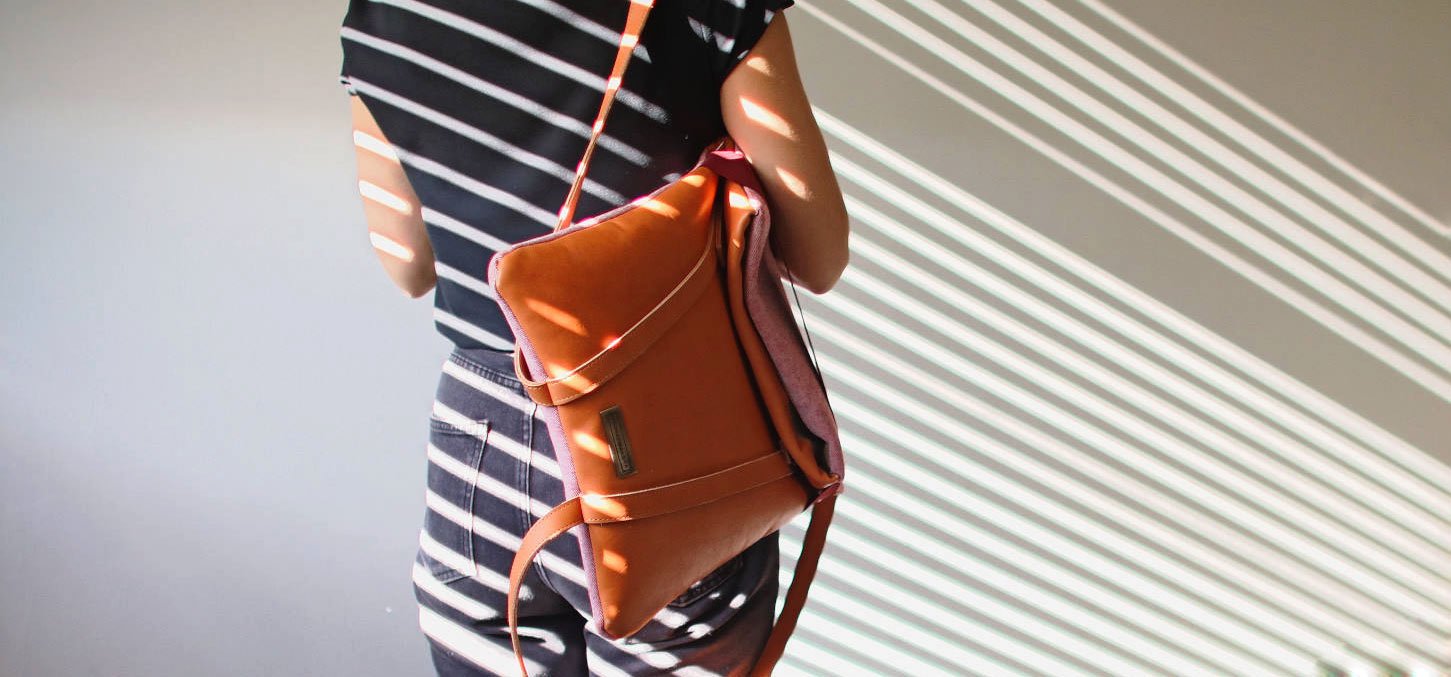 Women’s backpack. Orange camel premium sustainable metal-free tanned Leather. environmental-friendly. biodegradable and allergy-free. Back in light pink recycled cotton from PET bottles. Bordeaux elastic. and adjustable straps. Two inner pockets.